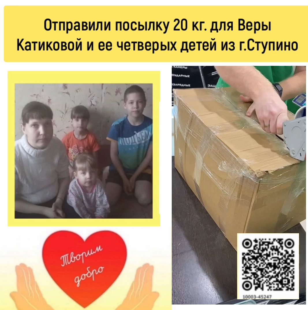 Дорогие друзья! Мы отправили посылку 20 кг. с продуктами для Веры Катиковой и ее четверых детей из города Ступино.