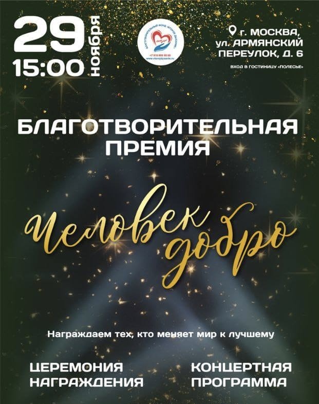 Приглашаем вас стать частью поистине доброго и важного события — первой благотворительной премии «Человек Добро», которая состоится 29 ноября 2025 в 15.00 по адресу: г. Москва, Армянский переулок, д. 6 (вход в гостиницу «Полесье»).