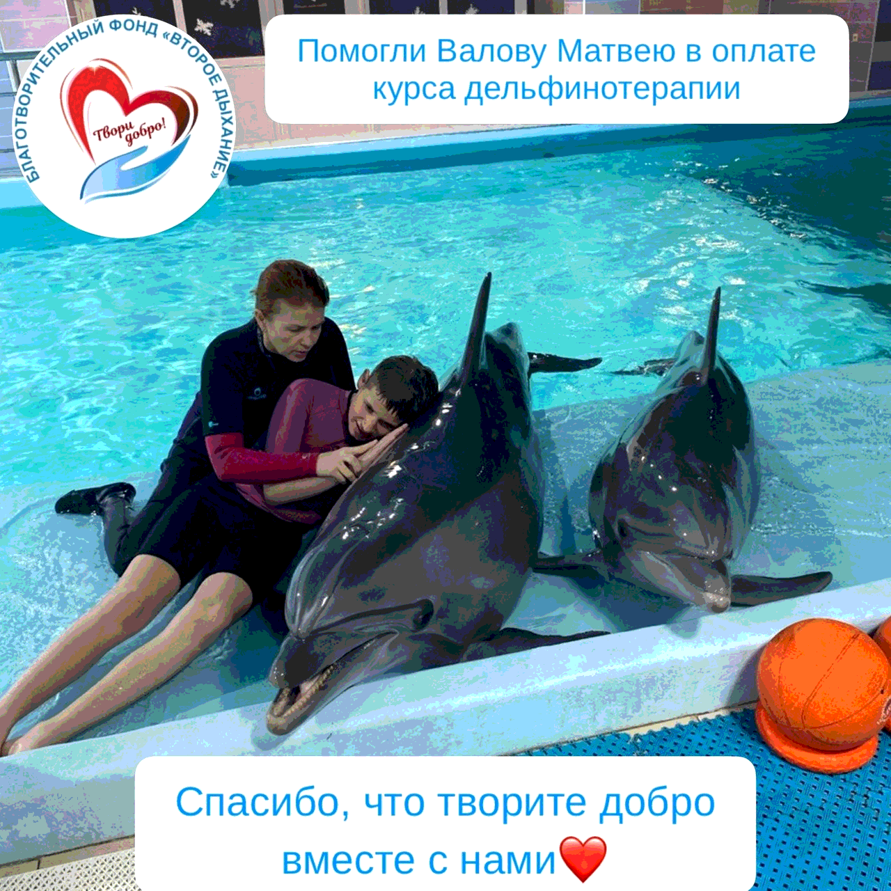 Дорогие друзья! С Вашей помощью нам удалось оплатить курс дельфинотерапии для Валова Матвея, 12 лет.
