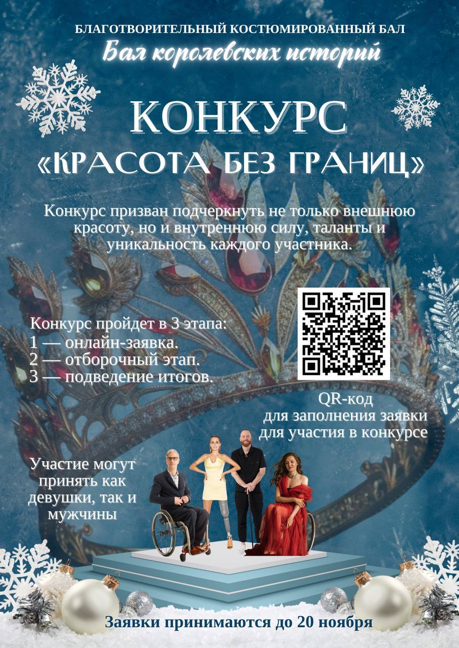 В рамках программы костюмированного благотворительного бала «Бал королевских историй» особое внимание будет уделено конкурсу красоты. Мы рады объявить о запуске конкурса «Красота без границ», который направлен на раскрытие многогранности личности людей с инвалидностью.